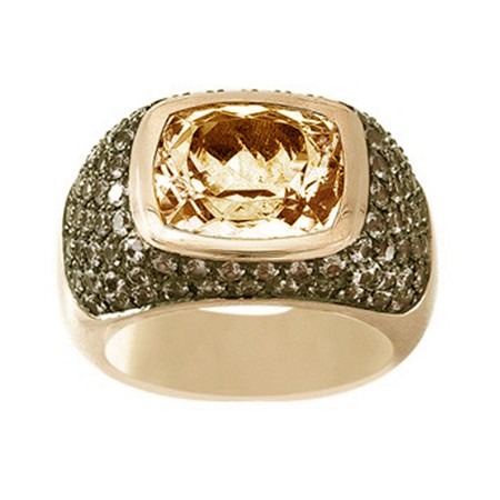 “The Bold Citrine Cigar Ring” is an 18kt Yellow Gold masterpiece, finger size 7.5, and set with approximately 1.00ct of Black Diamonds and a beautiful cushion shaped Natural Citrine.